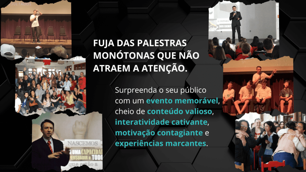 Oferecemos palestras desenvolvidas com o objetivo de tornar o seu evento ÚNICO e INESQUECÍVEL, e assim gerar uma experiência marcante com conteúdo, interação, hipnose e motivação.